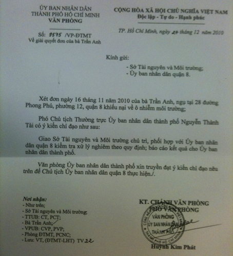 Từ tháng 12/2010, UBND TPHCM đã có Công văn số 9575/VP-ĐTMT truyền đạt ý kiến chỉ đạo của Phó Chủ tịch Thường trực UBND TPHCM Nguyễn Thành Tài gửi Sở TN&MT, UBND quận 8 yêu cầu kiểm tra xử lý nghiêm theo qui định. Tuy nhiên đến nay sự việc vẫn chưa được giải quyết dứt điểm, khiến người dân tiếp tục khiếu nại