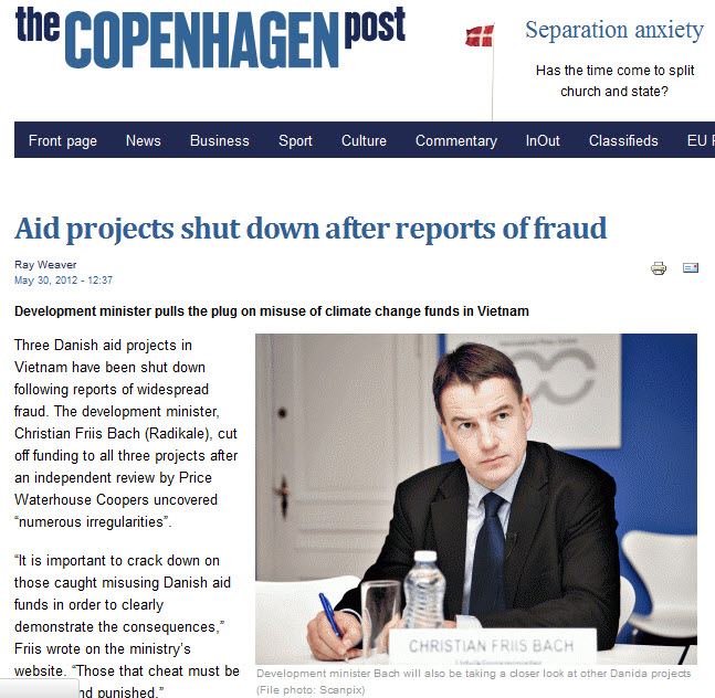 Nhận được báo cáo từ công ty Price Waterhouse Coopers, sau một cuộc điều tra độc lập, Bộ trưởng Bộ Phát triển Đan Mạch, Christian Friis Bach (Radikale) đã quyết định cắt viện trợ cho 3 dự án này sau khi phát hiện ra vô số điều bất thường.