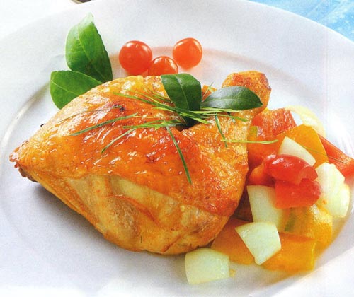 Sau đó cho hỗn hợp vừa khuấy ướp với đùi gà và để khoảng 15 phút cho thấm gia vị. Cho đùi gà vào lò nướng chín vàng 2 mặt. Sắp đùi gà ra đĩa, trang trí với lá chanh xắt sợi, ớt chuông, hành tây, dùng nóng.