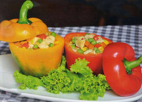 Có thể trang trí bằng cách cắt ngang gần núm quả ớt chuông để làm nắp, bày thịt gà xào vào trong quả ớt, trải ít xà lách ra đĩa, đặt quả ớt thịt gà lên. Dùng kèm nước tương pha ớt lát tùy thích.