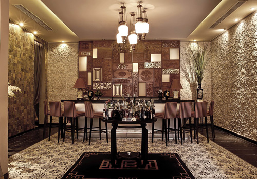 | Quầy bar được trang trí ấn tượng bằng những bức phù điêu gỗ với những nét chạm trổ đầy mê hoặc. |