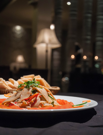 Gỏi bào ngư mang đến trải nghiệm khác hẳn, đó là những miếng bào ngư hầm nửa dai giòn, nửa như tan trên đầu lưỡi kết hợp hoàn hảo với vị cay, cái ấm, thơm của gừng, cay nồng của ớt, thơm của rau, giòn giòn của bánh….