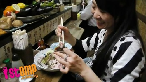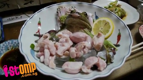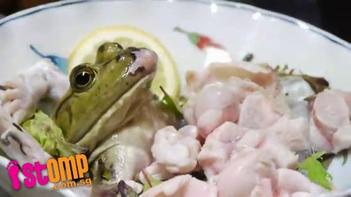 Món ếch sống được gọi là sashimi. Trong khi con ếch vẫn còn nhìn vào vị khách một cách đáng thương, đôi mắt còn co giật, nữ khách hàng này dường như không quan tâm. Thậm chí, sau khi ăn một miếng thịt ếch sống, cô ấy còn ra hiệu như món ăn rất ngon.