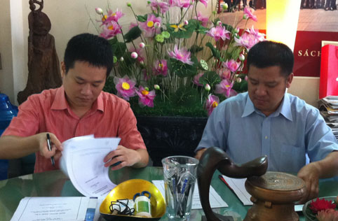 Ông Nguyễn Quang Minh- Phó tổng giám đốc Công ty CP Mgreen Media (trái) đại diện Tin Môi Trường và ông Lê Trần Trường An-Tổng giám đốc Công ty CP Kỷ lục -Vietkings đại diện Tổ chức kỷ lục Việt Nam ký kết hợp tác