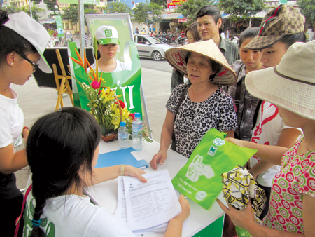 (09:59:18 AM 15/11/2012)Trong 2 ngày 10 - 11/11, Quỹ Bảo vệ Môi trường Hà Nội - Sở TN&MT Hà Nội đã tổ chức phát miễn phí 4.000 túi thân thiện với môi trường cho người dân, khách hàng đi mua sắm tại Chợ Hà Đông.
