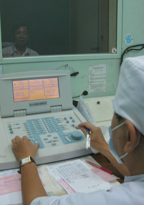 | Bác sĩ đang đo thính lực cho bệnh nhân tại buồng kín |