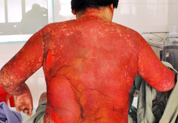 Sau ba ngày ngưng uống, gia đình phải đưa bà L. nhập viện. “Lúc nhập viện, bệnh nhân bị kích thích, lo lắng, cảm nhận khó thở. Toàn thân bệnh nhân nổi hồng ban sắc tố đen, nâu, sậm, da nóng, sưng căng, mắt mờ - thị lực 2/10, phù giác mạc. Bệnh nhân trong giai đoạn viêm - hoại tử cấp thượng bì (nhiễm độc da) do dị ứng thuốc” - BS Trần Thị Hoài Hương, Phó Trưởng khoa Lâm sàng 1 BV Da liễu TP.HCM, cho biết.