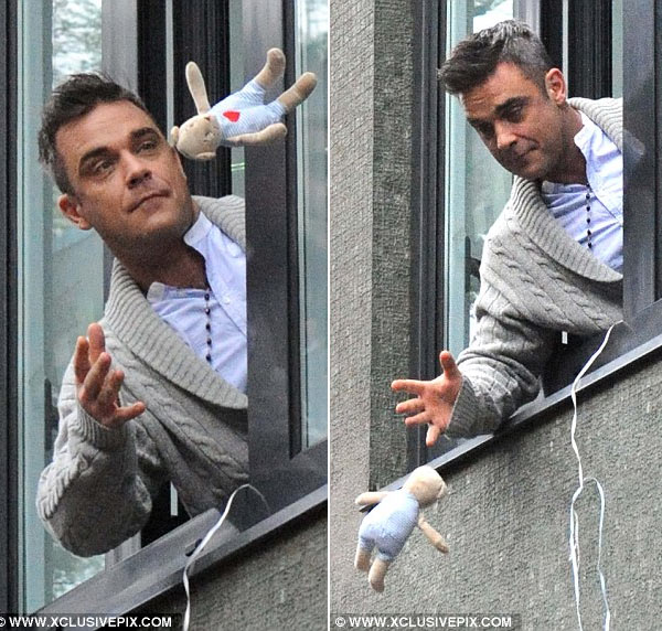 Vừa mở cửa sổ khách san, là Robbie đã được một fan tung gấu bông lên tặng.