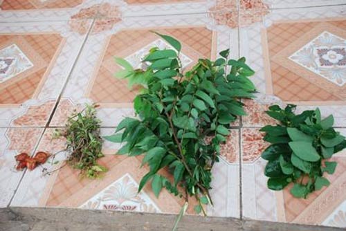 Đành theo chân bà về mà lòng vẫn không hết hồ nghi. Qua đám bờ rào, bà thò tay nhón một nắm lá khế. Qua mảnh vườn trước hiên nhà, bà tuốt chừng chục cọng rau ngót. Vào chái bếp ám khói bà lấy ra dăm nhánh hành khô. Đấy chính là ba nguyên liệu còn lại trong bài thuốc bí mật của bà Mua, trong đó lá khế chiếm nhiều nhất, một nắm khá chặt tay, lá ngót khoảng ½ nắm, lá nhọ nồi một nhúm cộng với ba bốn nhánh hành khô. Tất cả các thứ được bà Mua rửa thật sạch, cho vào cối giã. Vừa thong thả giã, bà vừa giảng giải: “Mùa mưa lá nhọ nồi sẵn thì dùng lá là tốt nhất còn mùa khô, lá trụi hết có thể đào lấy rễ để dùng cũng có công dụng như nhau”.