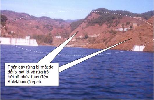 Hình 3: Phần rừng quanh hồ thuỷ điện Kulekhani (Nepal) bị chết do đất úng ngập và sạt lở (Ảnh: Bhesh Nath Ghimire, 2004) [4]