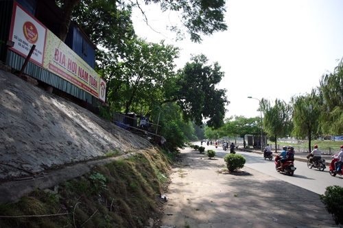 Dọc sông Tô Lịch, từ đường Nguyễn Khánh Toàn đến Hòang Quốc Việt nhiều đoạn xuất hiện tình trạng trên.