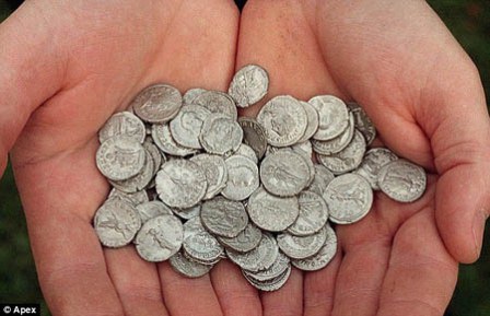 (15:32:14 PM 28/06/2012) Kho báu mà ông Reg Mead và Richard Miles tìm ra có khoảng 50.000 đồng xu có từ thế kỷ thứ nhất trước công nguyên, được tìm thấy ở độ sâu gần 1m trong một khu vườn ở Jersey. Mỗi đồng xu như thế có thể trị giá 200 bảng Anh.