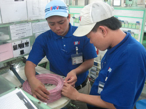 Anh Thái Anh Tuấn (trái) đang kiểm tra sản phẩm dây điện thành phẩm