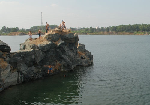 Rất đông sinh viên tập trung tại những mỏm đá cao rồi liều mình phóng xuống hồ.