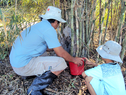 Lúc này, sau khi xác định “bản địa” của bò cạp, 4 người trong nhóm anh Lợi tiến hành lật từng tảng đá, bới lớp lá khô. Tuấn (17 tuổi) đưa cho mỗi người một cái xô nhựa, một cái cuốc to bằng bàn tay và một kẹp sắt (gần giống với kẹp gắp đá nhưng nhỏ và nhọn). “Đồ nghề đơn giản vậy thôi, nhưng lợi nhất vẫn là kẹp sắt và sự nhanh trí của người bắt” - Tuấn cho biết.