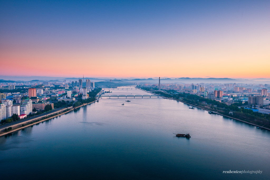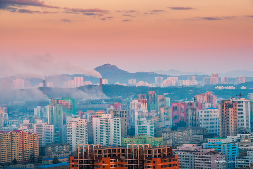 Dấu hiệu đầu tiên của mặt trời ở Bình Nhưỡng, thủ đô của Triều Tiên, là vùng trời màu hồn rực trên khung cảnh thoáng đãng.