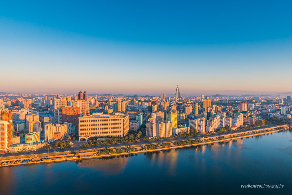 Khung cảnh tuyệt đẹp của thủ đô Triều Tiên nhìn từ một bên sông, với những tòa nhà cao tầng đủ hình dạng đan xen lẫn nhau.