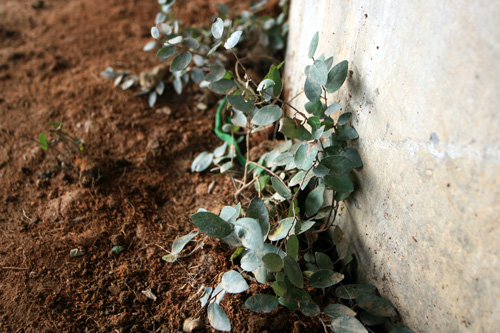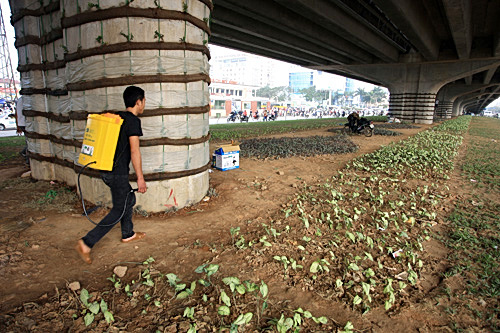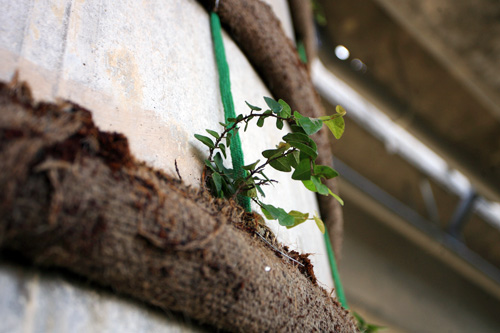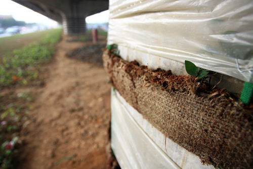 | Một số cây dây leo phía chân trụ cầu bắt đầu nhô lên, những người công nhân ở đây hy vọng, đến đầu năm 2013, cây sẽ cho ra hoa. |