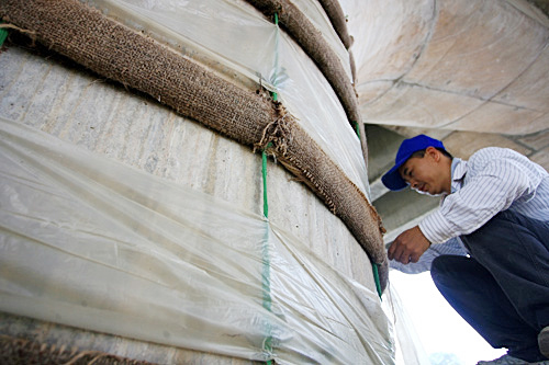 | Nylon được các công nhân cuốn bên ngoài đến khi cây vẩy rồng đủ lớn, dự tính khoảng một tuần nữa. |