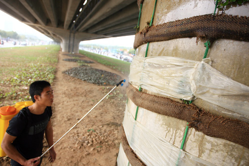 | 3 trụ cầu đường vành đai 3 được công ty cây xanh Ba Vì trồng thử nghiệm cây leo gần 2 tuần nay. |