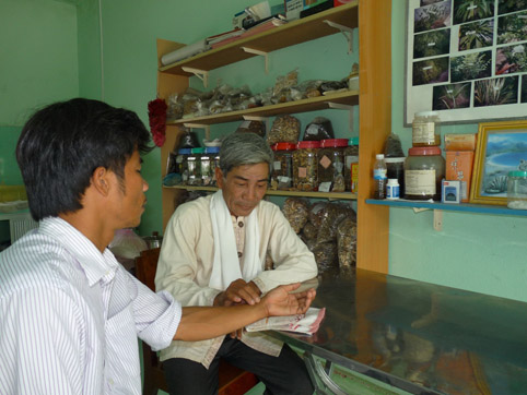 Khám bệnh bốc thuốc là việc thường thấy trong các gia đình ở An Nhơn – Phước Nhơn (Trong ảnh, lương y Nguyễn Văn Thừa đang xem bệnh cho bệnh nhân tại nhà.)