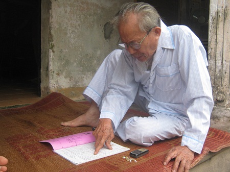 | Cụ Úc đang kể với PV và con cháu về lịch sử làng. |