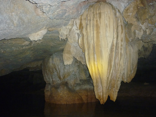 Anh Thái còn cho biết muốn vào được bên trong cần phải qua cửa hang chính bằng thuyền bơi trên hồ rộng khoảng 1 sào rồi cứ theo hướng nước bơi thuyền vào động. Vì là người thông thạo địa hình nên chẳng mấy chốc anh Thái đã đưa chúng tôi vào bên trong hang động.