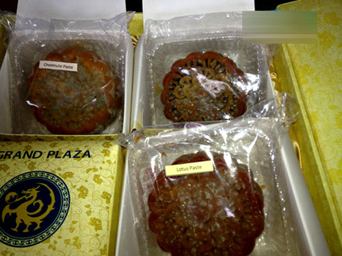 | ... nhưng cả 2 hộp đều có biểu hiện mốc và đổi màu. Bên ngoài của những hộp bánh này hoàn toàn không có ghi thành phần của bánh. Mặc dù, theo lời giới thiệu của nhãn hàng “Bánh trung thu GRAND” thì đây là những chiếc bánh nướng hay bánh dẻo độc đáo với nhân đậu đỏ, hạt sen, hạt dẻ cười và trà xanh được chuẩn bị từ những đầu bếp có tay nghề của Grand. |