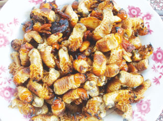 Để có món đuông chiên giòn ngon nhớ đời, người Trà Vinh còn “bày” ra cách nhét đậu phộng. Món đuông nhét đậu phộng chiên nước mắm khi cắn chúng sẽ nghe tiếng lụp bụp của hạt đậu phộng trong miệng, đặc biệt là vị béo của đuông hòa vị béo bùi của đậu phộng, thật là khoái khẩu. “Ác liệt” hơn nữa món đuông cũng chế biến như cách trên, nhưng nhúng vô hột gà đánh tan, lăn bột mì (hoặc bột năng) đem chiên. Món này ăn vừa ngon lại nghe rỉ tai là “đại bổ”...