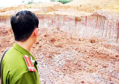 | Tại đây, một khu đồi đã bị bạt ngang với vô số hầm hố sâu từ 5-7 m. Đây là hầm hố do nạn khai thác khoáng sản để lấy trộm đất sét và đất phún (loại đất sỏi đỏ) là loại khoáng sản có giá trị kinh tế cao với nhu cầu thị trường lớn. Tại hiện trường, lực lượng chức năng phát hiện rất nhiều hầm hố bị đào ngổn ngang và đang trong hiện trạng khai thác khoáng sản, trong đó có một hầm đang đào còn in dấu máy xúc, máy đào.