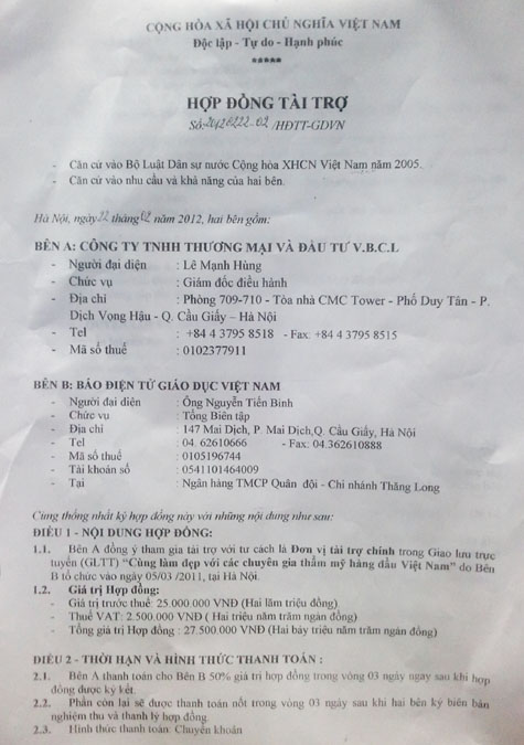 | Hợp đồng tài trợ được ký kết giữa Báo điện tử Giáo dục Việt Nam và công ty TNHH thương mại và đầu tư V.B.C.L |
