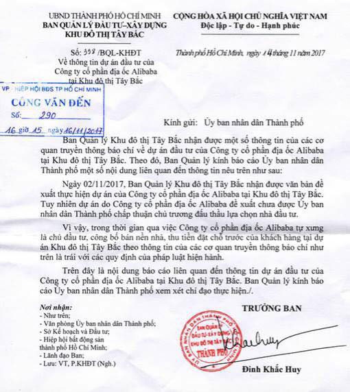 (09:58:37 AM 17/11/2017)Hiệp hội Bất động sản TP HCM (HoREA) cho biết thời gian qua, hiệp hội đã nhận được nhiều thông tin phản ánh của doanh nghiệp và người tiêu dùng về trường hợp Công ty CP Địa ốc Alibaba và Công ty CP Alibaba Tây Bắc TP HCM có những dấu hiệu nghi vấn về việc tăng vốn điều lệ "ảo"; công bố bán nền nhà, thu tiền trước của khách hàng "kiểu kinh doanh đa cấp" tại nhiều dự án đất nền chưa có đầy đủ thủ tục pháp lý, chưa đủ điều kiện để được huy động vốn khi bán nền nhà hình thành trong tương lai theo quy định của Luật Kinh doanh bất động sản, Luật Quy hoạch khu đô thị, trên địa bàn các tỉnh Đồng Nai, Bà Rịa - Vũng Tàu, Bình Dương, Long An và gần đây là tại TP HCM. Điều này đã có tác động xấu, làm nhiễu loạn thị trường bất động sản và có thể gây hậu quả nghiêm trọng, làm thiệt hại đến quyền lợi của khách hàng, của nhà đầu tư thứ cấp.