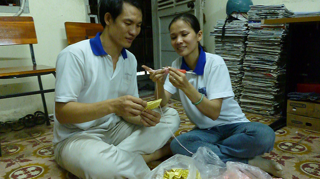 | Cả ngày đi làm ở Long An, tối về Sài Gòn, cặp đôi Tú - Quý lại cặm cụi làm đồ thủ công để kiếm thêm thu nhập - Ảnh: BÌNH THANH |