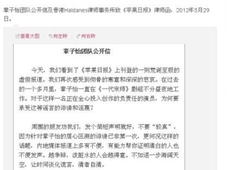 Phía Chương Tử Di gọi đây là “lời bịa đặt trắng trợn, đổi trắng thay đen” và có ảnh hưởng nghiêm trọng đến danh dự của nữ diễn viên này.