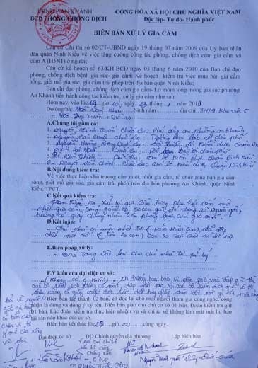 | Biển bản xử lý gia cầm được căn cứ vào chỉ thị từ năm 2009. Văn bản này thừa nhận tự ý xông vào nhà đập chết cả đàn gà |
