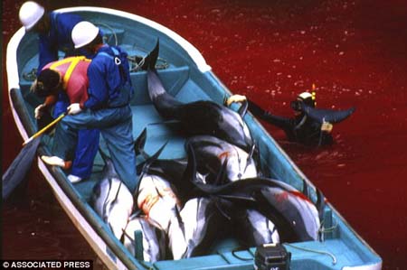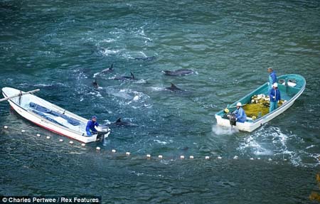 Thỉnh thoảng một vài con cá heo có thể may mắn lao mình lên mặt nước và vượt qua vòng vây lưới để trở lai biển. Dù vậy, trong làn nước đỏ ngàu máu, hầu hết những con đã bị bắt vào đây hoặc bị bán hoặc sẽ bị xẻ thịt. Những cảnh tượng này được phóng viên điều tra của tờ Daily Mail ghi lại trước dịp Giáng Sinh, đúng vào mùa săn cá heo của ngư dân Nhật.