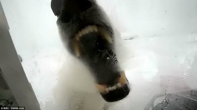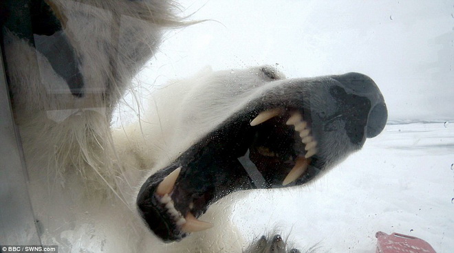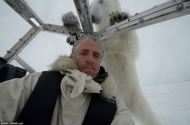 Loạt ảnh gấu Bắc cực tấn công nhà làm phim Gordon Buchanan đang ở trong lồng kính - Ảnh: Daily Mail