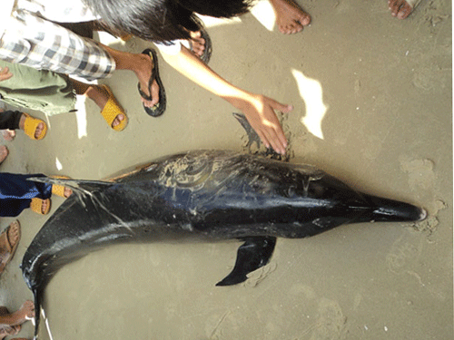 (14:39:30 PM 19/07/2011)(Tin Môi Trường) - Chiều 18/7, tại bãi biển thôn Lộc Đông (xã Tam Tiến, huyện Núi Thành - Quảng Nam), người dân phát hiện 1 con cá heo trôi dạt vào bờ.