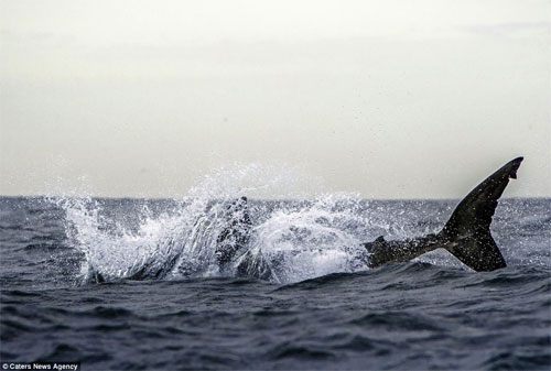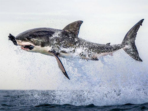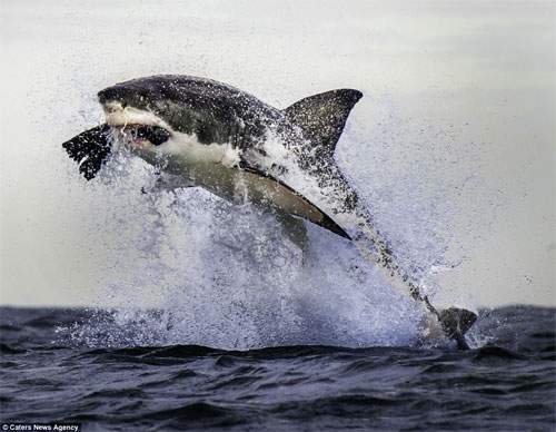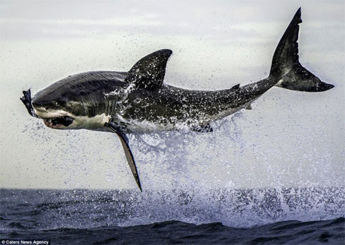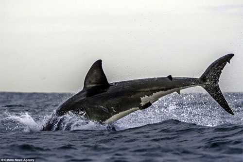 Một chú cá mập trắng dài 4 mét đã mắc bẫy và bay trên mặt nước một cách khó tin để bắt “hải cẩu”.