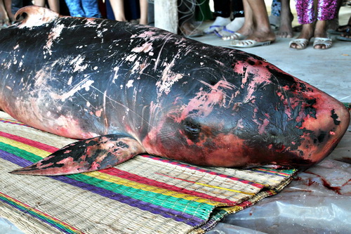 | Một trong 3 con cá voi phát hiện trôi dạt vào bờ biển Bạc Liêu bị chết. |