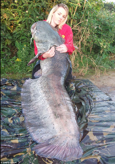 (10:46:40 AM 10/08/2012)Đó là một con cá da trơn tương tự cá trê ở Việt Nam, nặng 54kg và dài khoảng 2,1m. Người câu được nó là một cô gái 20 tuổi "lùn" hơn con cá đáng kể: chỉ cao 1,57m.