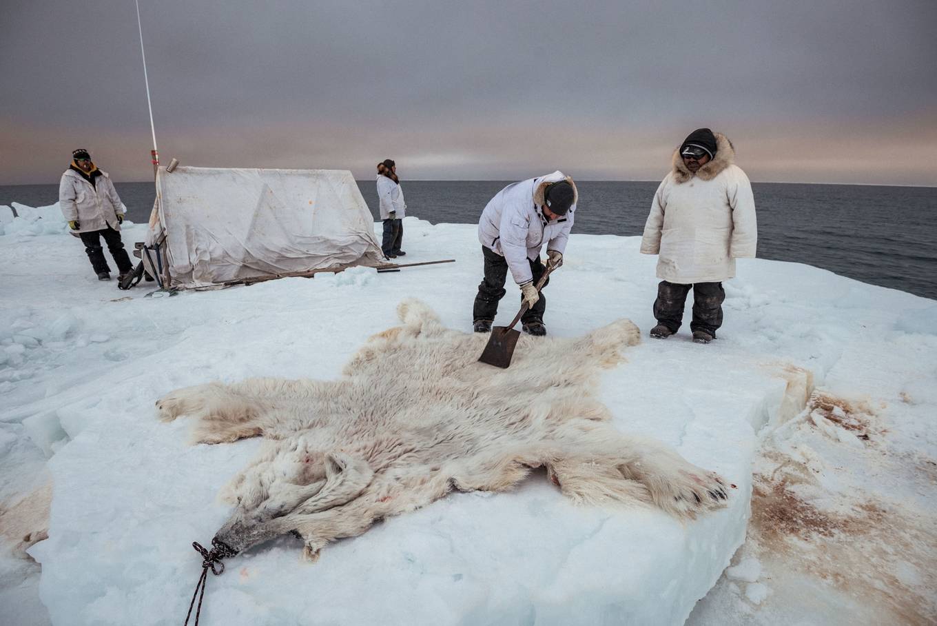 Nhóm thợ săn ngồi trên Umiak để tìm kiếm dấu vết một con cá voi. Umiak là loại thuyền lâu đời của người Inupiat (hay còn gọi là người Eskimo) ở bang Alaska, Mỹ, với bộ khung làm từ gỗ hoặc xương cá voi và bọc da hải cẩu bên ngoài. Theo truyền thống, chiếc thuyền được sử dụng vào mùa hè để chở người cùng các vật dụng đến địa điểm săn cá voi, hải cẩu.