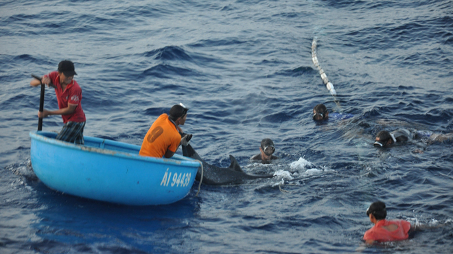 | Ngư dân nỗ lực cứu những chú cá heo dính lưới tại vùng biển Trường Sa - Ảnh: Tấn Vũ |