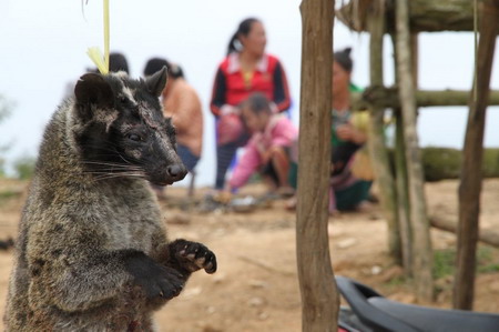 | Chỉ có một tỉ lệ rất ít động vật rơi vào tay thợ săn được kiểm lâm giải cứu. Đại đa số không được may mắn như vậy. Trong ảnh là một con cầy sắp bị xẻ thịt taị một ngôi làng ở Lào, gần biên giới Việt Nam. Nhiều cánh rừng đã bị chặt phá đến mức trống rỗng tại khu vực này. |