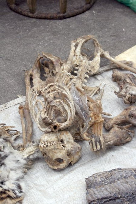 | Những bộ xương của cu li tại một khu chợ ở Mong La, Myanmar, gần biên giới Trung Quốc. Thịt nhiều loài linh trưởng được coi là một món ăn ngon, cũng như vị thuốc quý tại một số khu vực của châu Á. |