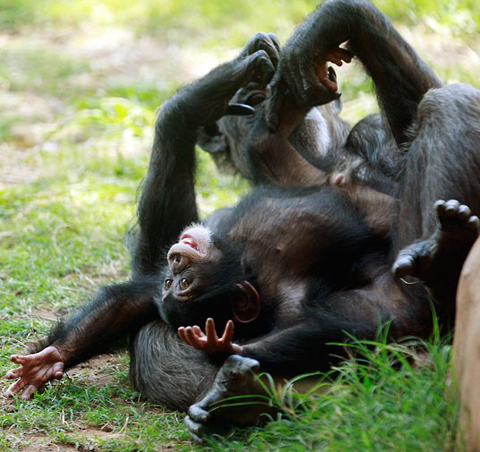 | Tinh tinh Ruben chơi đùa cùng mẹ nuôi của nó trong vườn thú thành phố Oklahoma, Mỹ. Mẹ của Ruben đã chết đúng một ngày sau khi nó chào đời và nhân viên vườn thú phải giao nó cho một con tinh tinh cái khác để nuôi. Ảnh: AP. |