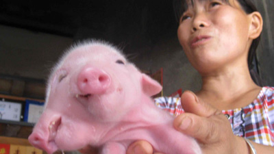 Con lợn nhà chị Zhang Hongxiu sống ở Jiangyou, tỉnh Tứ Xuyên, Truug Quốc, khi sinh ra đã có đến…2 mõm và 3 mắt. Ngoài 2 mắt như bình thường nó có thêm 1 mắt trên trán. Khi sinh ra nó chỉ nặng 0,7 kg - bằng một nửa so với lợn con bình thường. Cả 2 mõm của con lợn này có thể bú sữa cùng một lúc được.