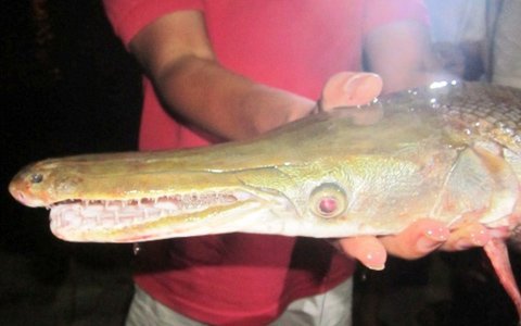 Đặc biệt, con cá có đầu dài và hình dạng như đầu cá sấu, trong miệng mọc 2 hàm răng thưa và nhọn hoắt. Con cá có trọng lượng chừng 5kg.