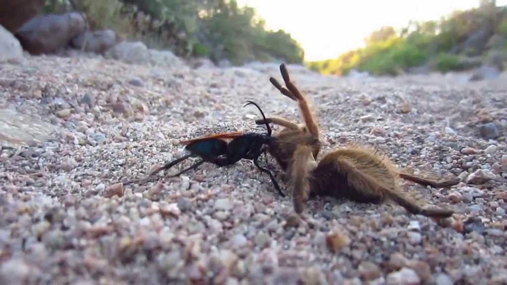 Ong Tarantula Hawk: Loài ong này săn nhện đen, đốt cho con mồi tê liệt trước khi lôi về tổ. Ở đó, chúng đẻ trứng trong bụng con nhện. Khi nở, ấu trùng ong sẽ ăn phần bên trong con mồi, đến lúc trưởng thành thì phá vỏ chui ra. Ảnh: Wired.