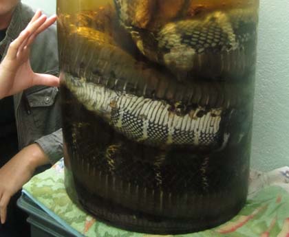 Nhìn cái đầu to tướng, bè bè, với đôi mắt to đúng bằng quả trứng gà, mà ai cũng choáng. Chồng chị H. lấy thước ra đo và thấy nó dài đúng 7m, cân nặng 21kg. Chiếc bình thủy tinh có chu vi tới 1,2m, mà cuộn con rắn hơn 6 vòng mới hết.
